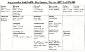 Die Begegnungsstätten „SHG-Treff“ in Stadthagen, Rinteln, Bückeburg und Bad Nenndorf sind Orte zum Kennenlernen. Sie bieten vielfältige Möglichkeiten zum Knüpfen von Kontakten oder um sich beraten zu lassen. Besucher*innen erhalten Anregungen und Tipps unter anderem zur Tagesgestaltung und für den gemeinsamen Austausch.